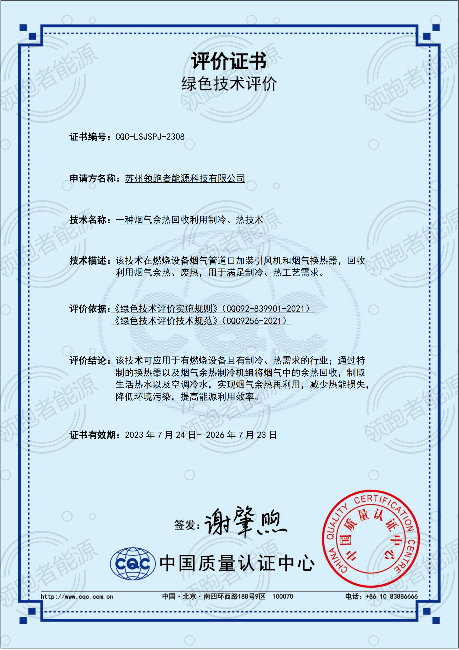 近日,z6com尊龙凯荣获由中国质量认证中心公布的“一种烟气余热接纳利用制冷、制热技术”CQC绿色技术评价证书。CQC......