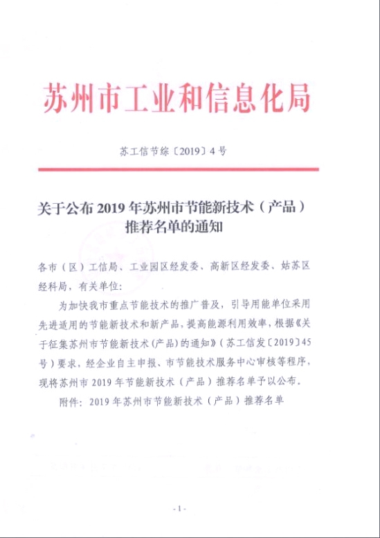 近日,苏州市工业和信息化局宣布了《苏州市2019年节能新技术(产品)》推荐名单,我司乐成入选该名单。《苏州市2019年节能新技术(产品)》是......